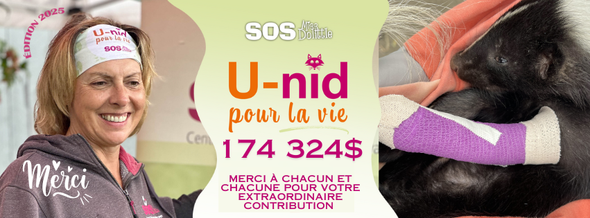 • Merci à tous les participants et participantes du défi U-Nid pour la vie. Vous avez fait campagne auprès de votre communauté, avez posé des gestes concrets pour nous permettre d’aider le plus grand nombre d’animaux sauvages possible en détresse. Ensemble, vous avez amassé 11 958$;