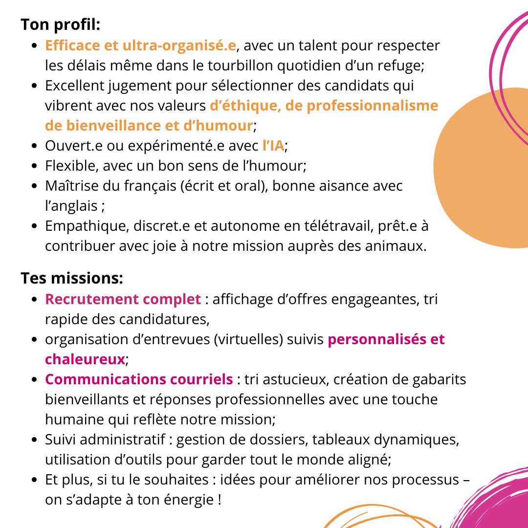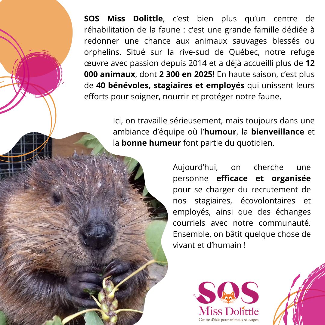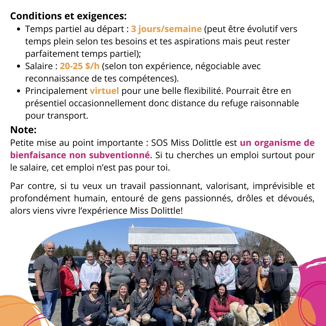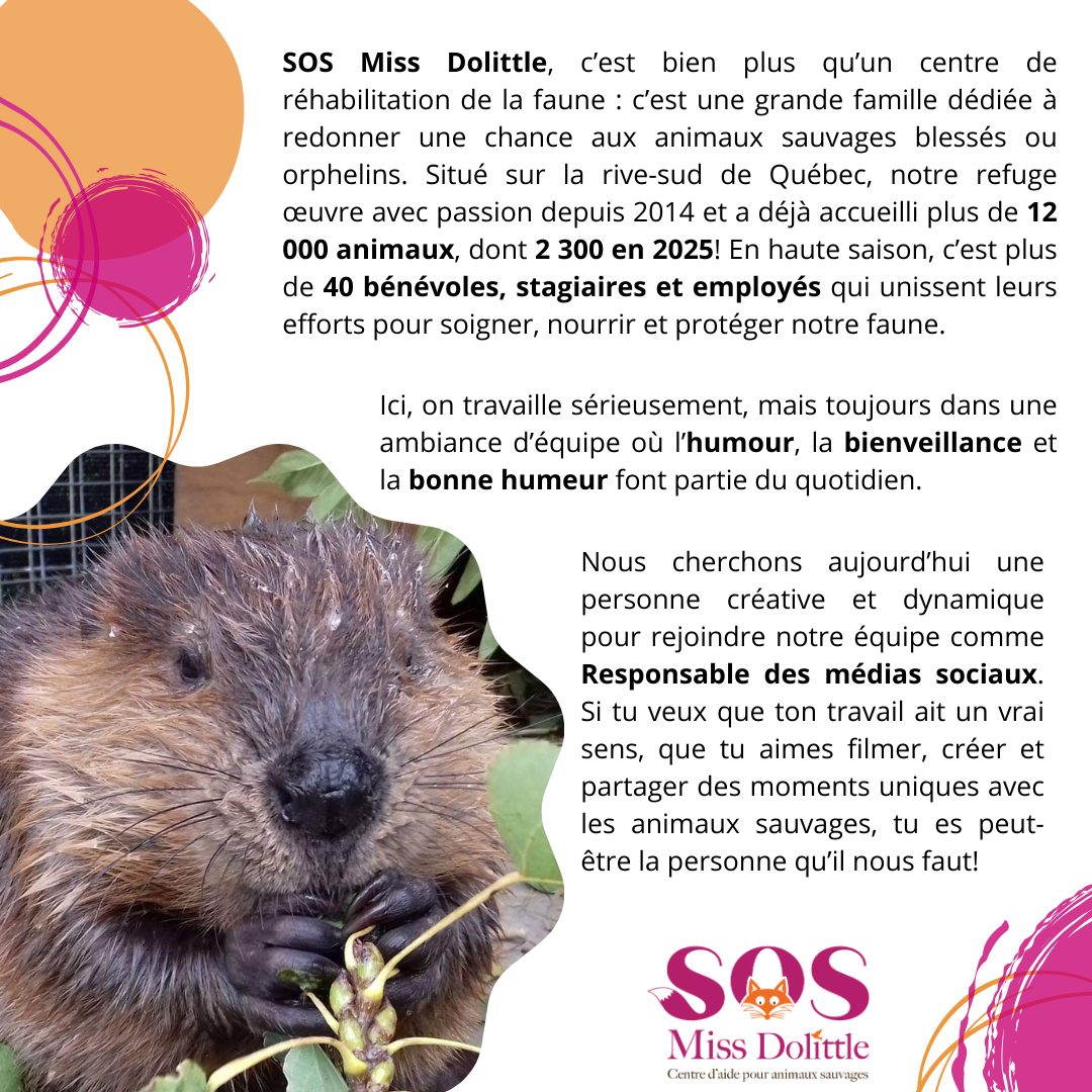 SOS Miss Dolittle cherche son ou sa Responsable des médias sociaux et création vidéo — une personne pleine d’énergie, d’idées et de cœur pour raconter la vie fascinante du refuge.