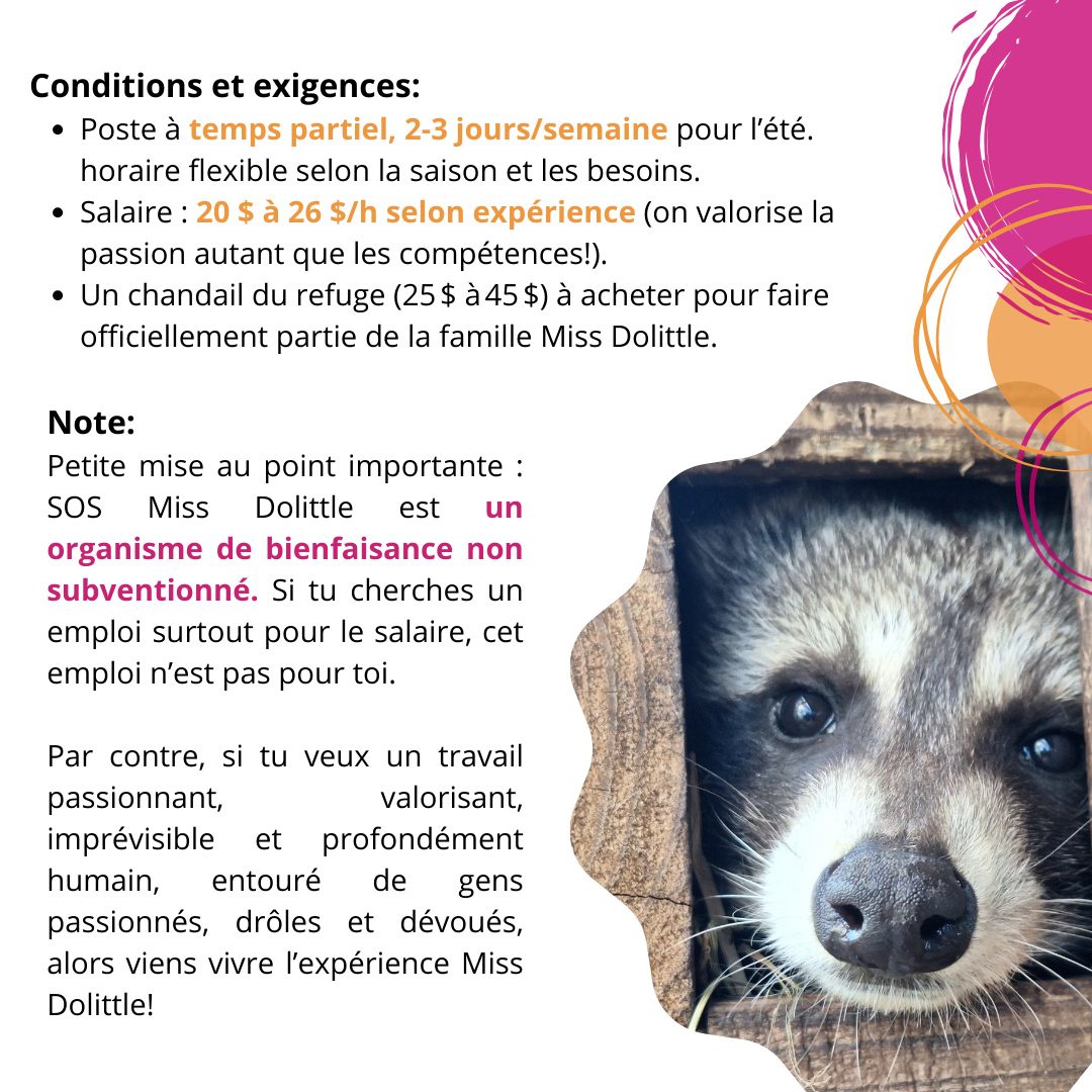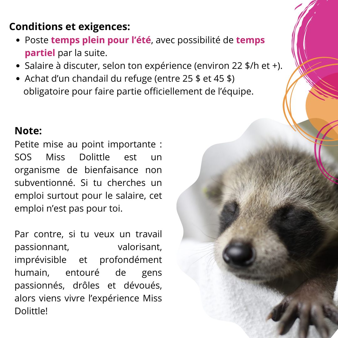 SOS Miss Dolittle est un organisme de bienfaisance non subventionné! Si tu recherches un emploi payant pour ton été, pour te faire plein de cash, pas la peine d'appliquer chez SOS Miss Dolittle. Notre réalité ne nous permet pas ça!