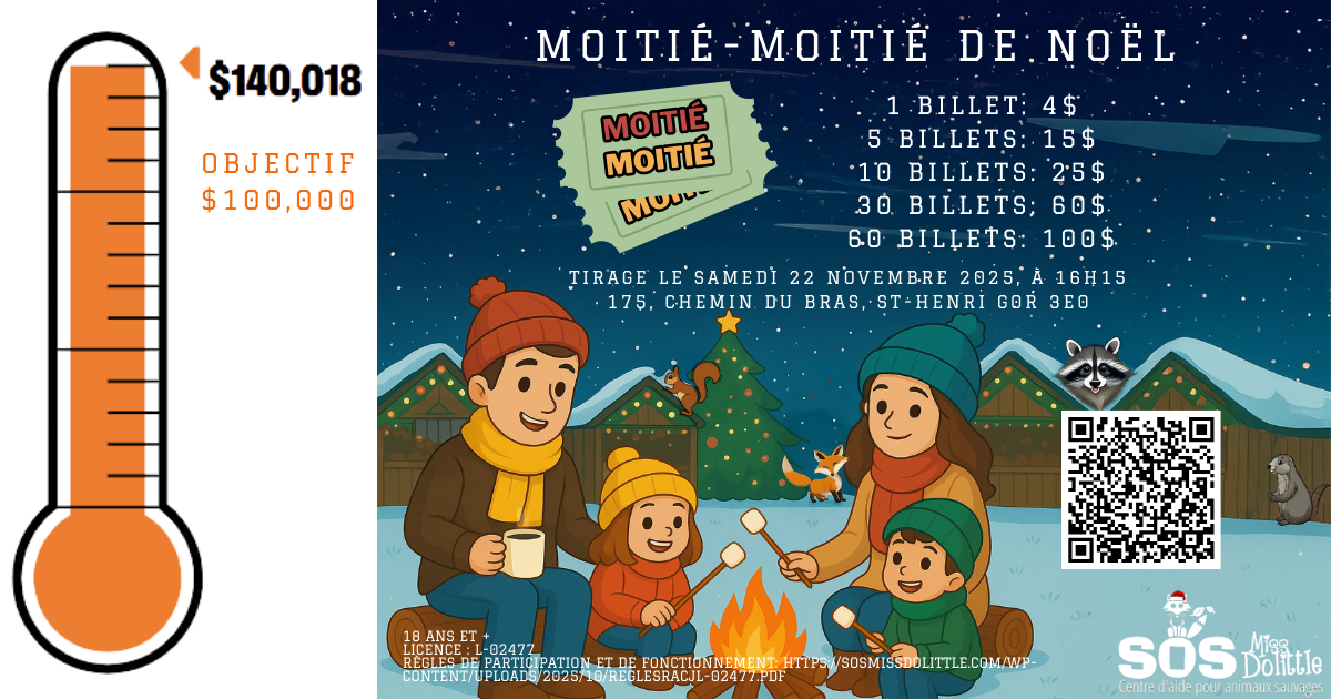 SOS Miss Dolittle a organisé un tirage moitié-moitié (Licence RACJ : L-02477) samedi 22 novembre 2025, pour le Marché de Noël de SOS Miss Dolittle. Tous les profits serviront à sauver et réhabiliter les animaux sauvages.