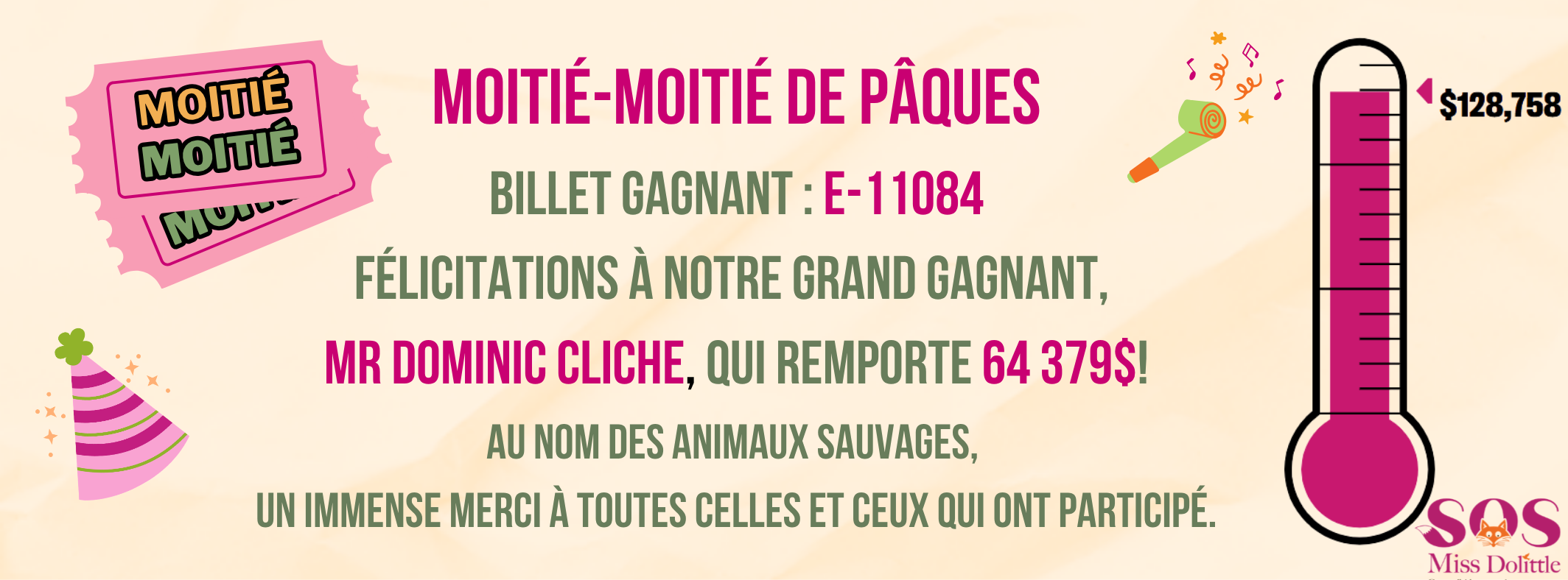 - Règles de participation et de fonctionnement des loteries de type moitié-moitié de SOS Miss Dolittle sont disponibles ici