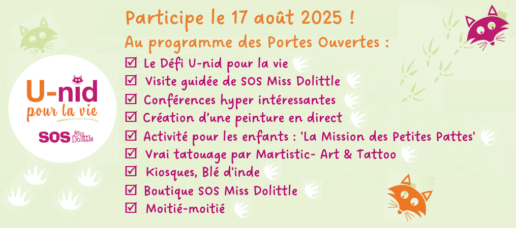 SOS Miss Dolittle organise cette activité dans le cadre de la campagne U-nid pour la vie. Tous les profits serviront à sauver et réhabiliter les animaux sauvages.